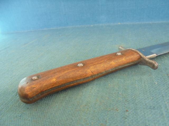 The knife is 10.75" overall with a steel guard, hardwood grip, and its original scabbard with the three prongs S/n 03104