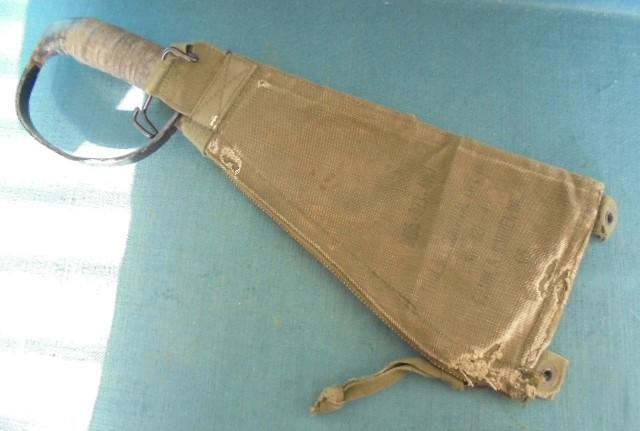 The knife is 15" overall with a D-guard and a stacked leather grip, and it has its original canvas sheath stamped U.S. and back, 66(1966?) S/n 03109