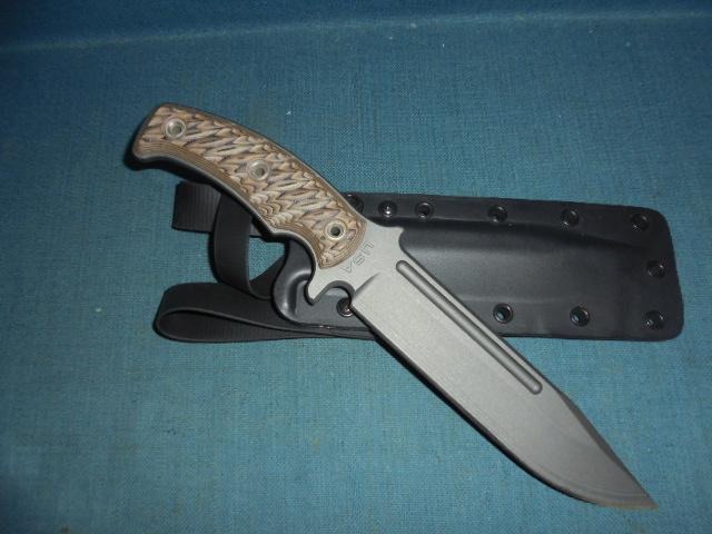 The knife is 12" overall with a Hyena brown G10 grip pinned onto the full tang, and the knife comes with its Kydex sheath cert, and box S/n 03130