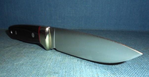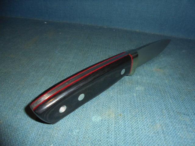 The knife is 8.5" overall with a black micarta grip with rad liners and it has a black leather sheath S/n 03133