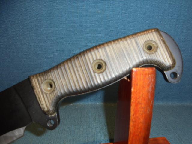The knife has a black canvas micarta grip screwed onto the full tang, and comes with a Nylon eagle sheath S/n 03140