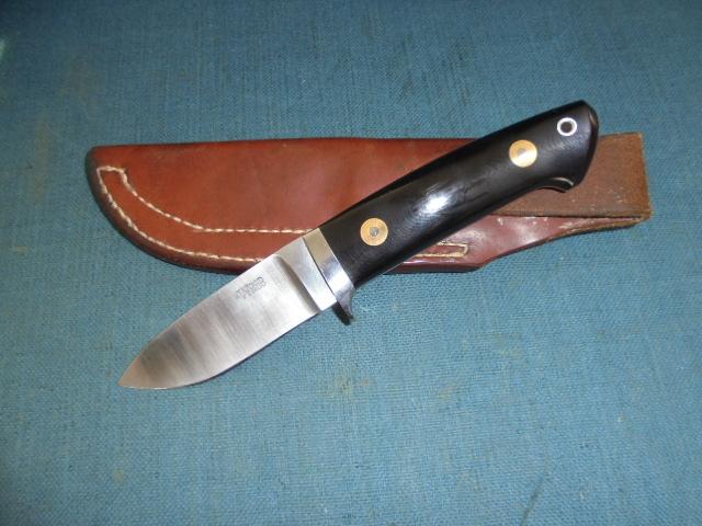 The knife has a steel guard, tapered tang, and black micarta grips with its custom-made sheath S/n 03156