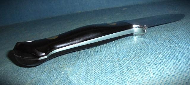 This is an early knife by Alan with a 3.5" drop-point blade stamped A WOOD ENGLAND, and it is 8" overall