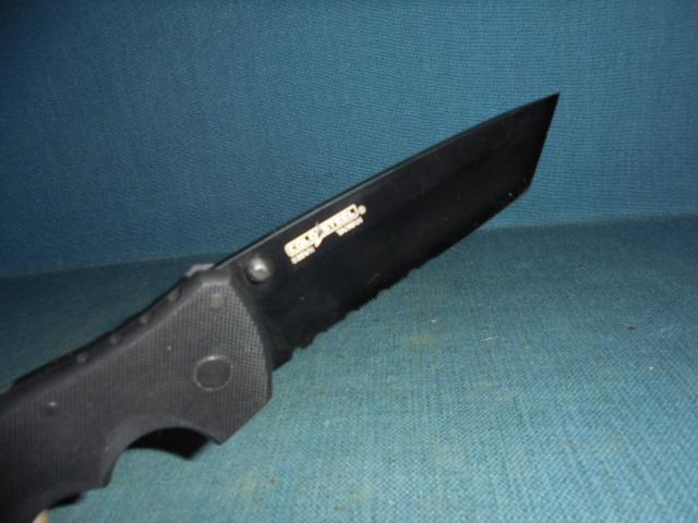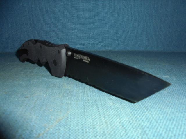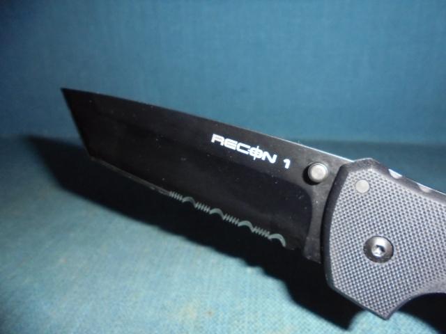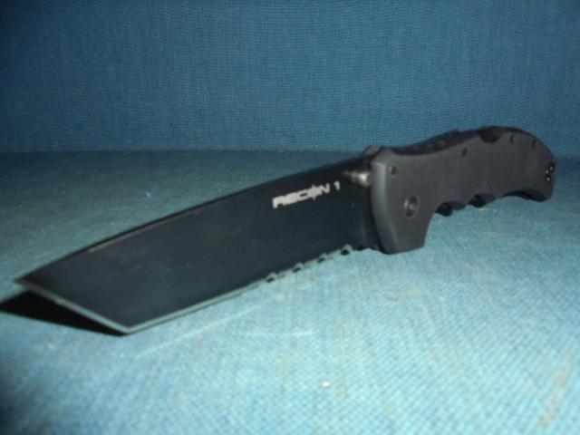 This is a large folder with a 4" Tanto blackened blade, with serrations etched COLD STEEL S35VN TAIWAN on one side and RECON 1 on the other