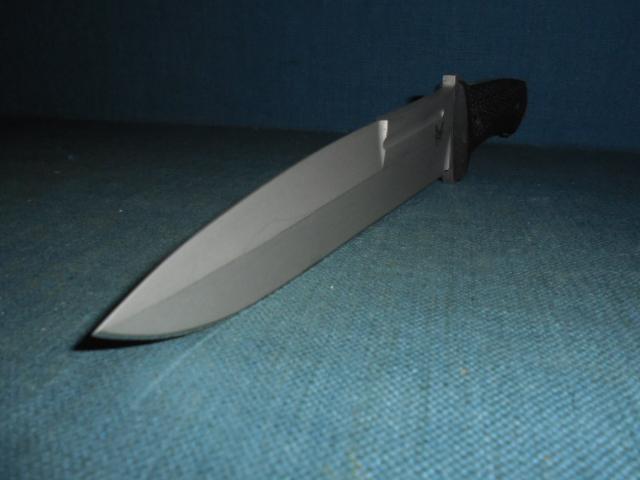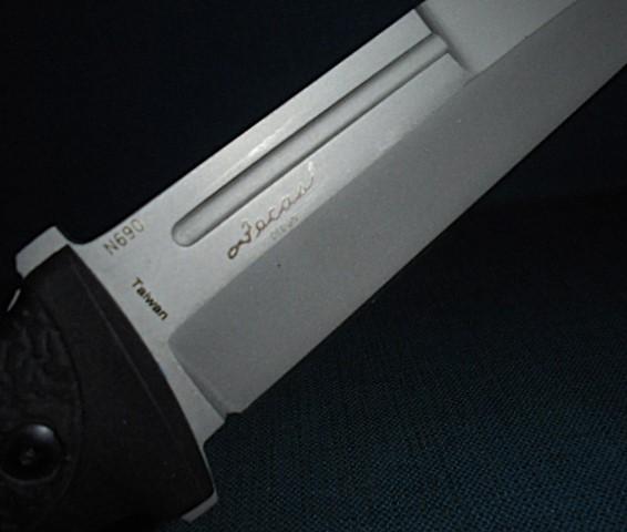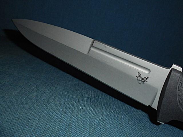 This is a large combat knife with a 7" satin-finished blade etched BENCHMADE plus logo on one side and Fecas DESIGN N609 Taiwan on the other