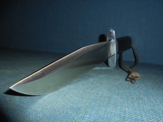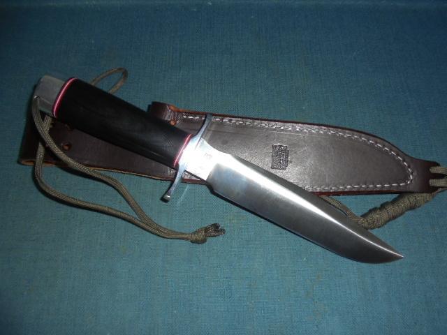 The knife is 12" overall with a steel crossguard pommel, and a black micarta grip with black/red and white spacers, and it has its original sheath stamped on the back S/n 03248