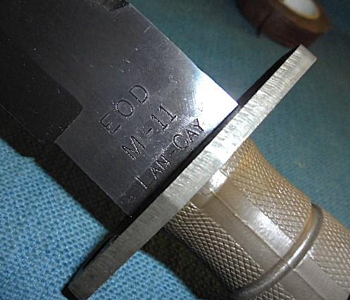 This one has a 7" blackened blade, saw spine, and a wire cutting hole stamped E O D M-11 LAN-CAY, and it is 12" overall with a steel crossguard. pommel, and a green plastic grip
