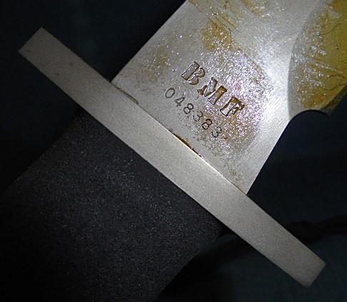 This is the larger version of this knife with an 8.95" clipped satin-finished blade stamped GERBER U.S.A. on one side and BMF 048383 on the other