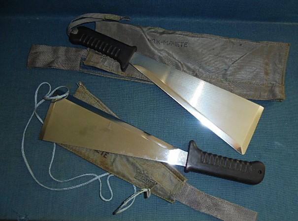 These machetes were issued to Russian pilots and also Cosmonauts, and have a 9.5" polished blade, with one stamped 483 4825 on the spine and the other 180 197