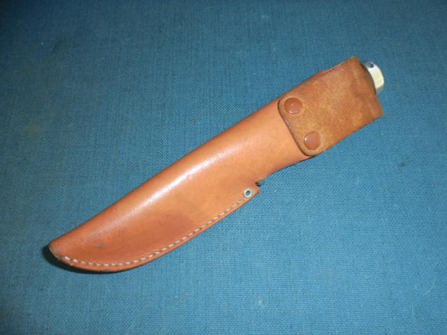 The knife has a stacked leather grip with red/black and white spacers, and it has its original sheath S/n 03266
