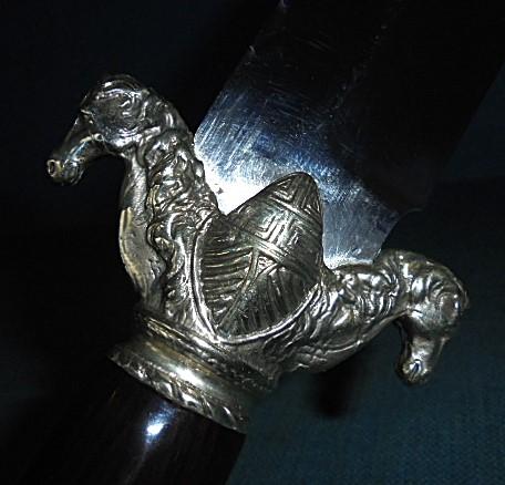 The knife is 18" overall with an ornate horse head crossguard and pommel with a black buffalo horn grip, and it comes with a standard sheath stamped RM on the belt loop S/n 03272