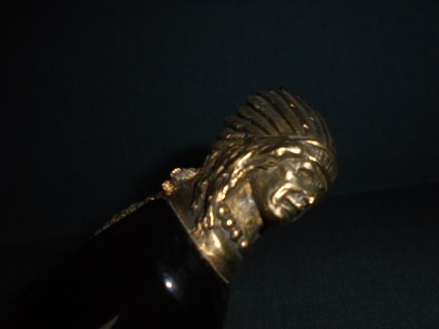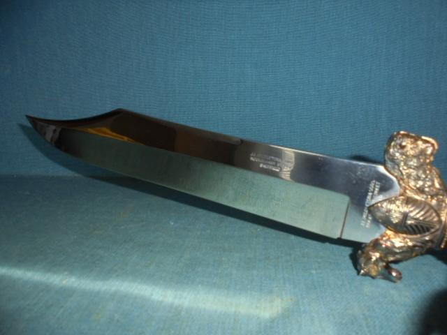 The knife is 18.5" overall with an ornate crossguard showing a horse head and a buffalo head, with the pommel having the very rare Indian head, a black buffalo grip, and it has a standard sheath S/n 03273