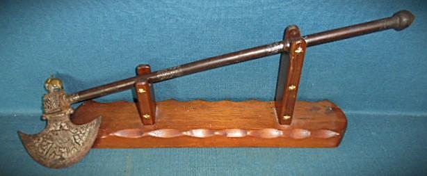 It's a Persian Tabar battleaxe, 22" overall, with the axe head decorated with silver inlay of a flower on one side and an elephant on the other