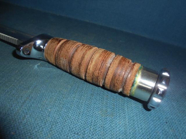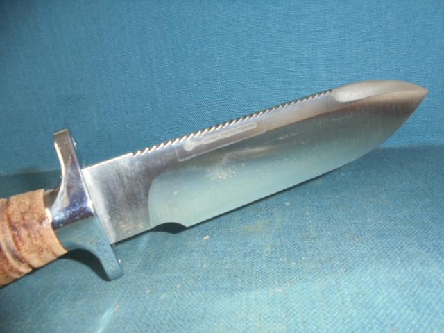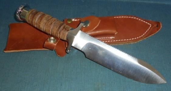 The knife is 11.95" overall with a stacked leather grip and a hollow handle, and the knife comes with its original sheath S/n 03336
