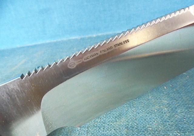 This is only the second one of these knives I've owned, and this one is in mint condition with a 6.95" spear-point blade with a serrated spine and etched HACKMAN FINLAND STAINLESS