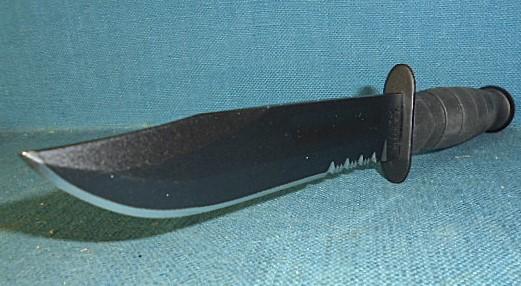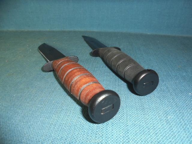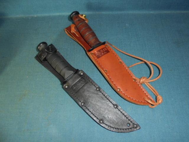 Here are two Ka-Bar knives with 5.25" blackened blades, one with serrations, and both stamped KA-BAR OLEAN, N.Y. on one side and USA on the other