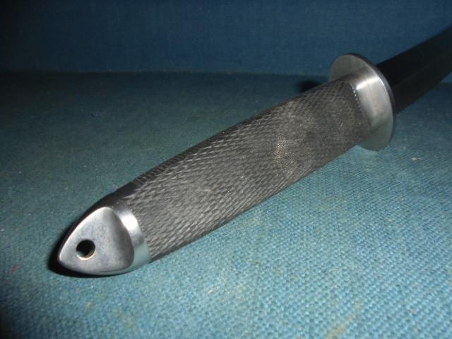 The knife is 13" overall with a steel guard pommel and a chequered rubber grip, and it has its original black sheath S/n 03365
