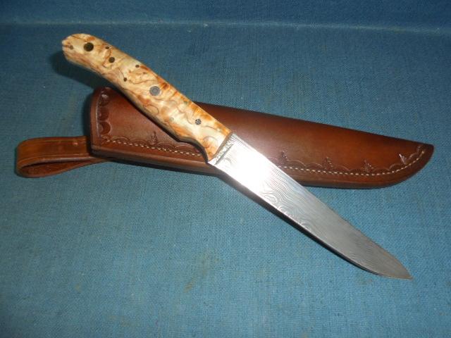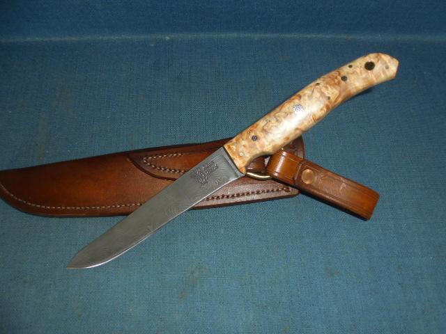 The knife has a tapered tang with blue liners and a birch grip, and it comes with its original sheath and booklet S/n 03366