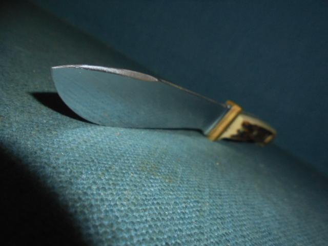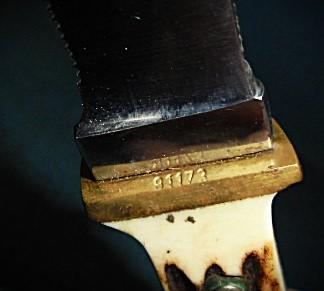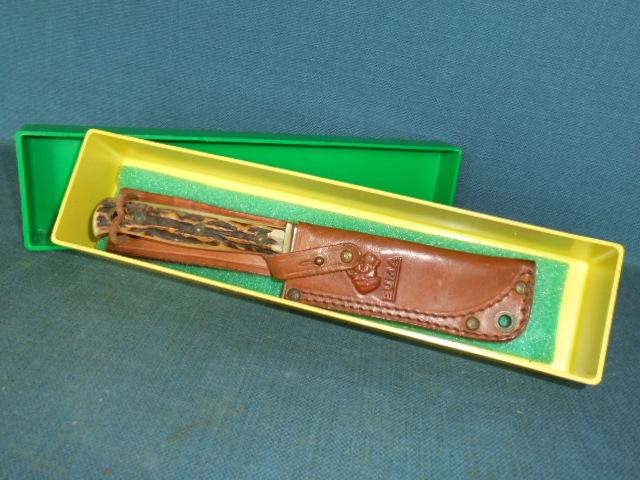 The knife is 8" overall with a small brass guard stamped 81173, and a stag horn grip, and it has its original sheath and yellow/green box S/n 03369