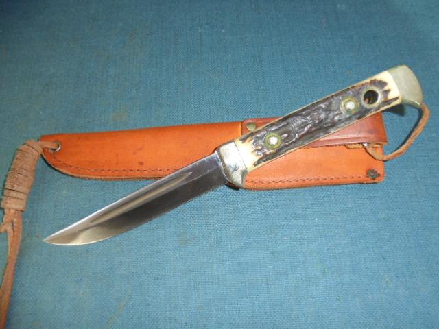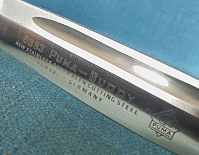 This is a rare knife with a 4.75" blade etched 6383 PUMA-BUDDY NEW STAINLESS SUPERKEEN CUTTING STEEL HANDMADE GERMANY with the cat's head logo plus a Rockwell stamp
