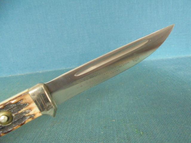 The knife is 9.5" overall with a stag horn grip, nickel-silver pommel, and a guard stamped 94374, and it comes with its original sheath, and a yellow/green box S/n 03370