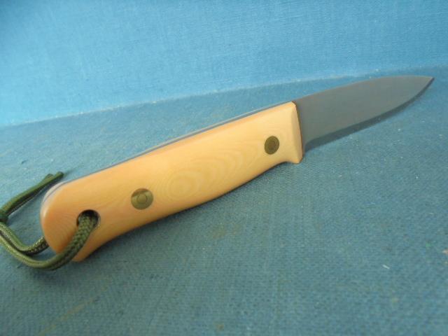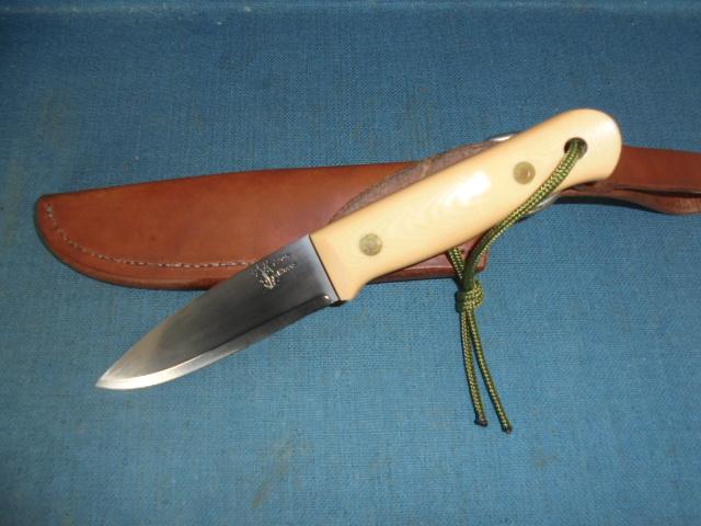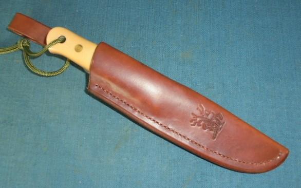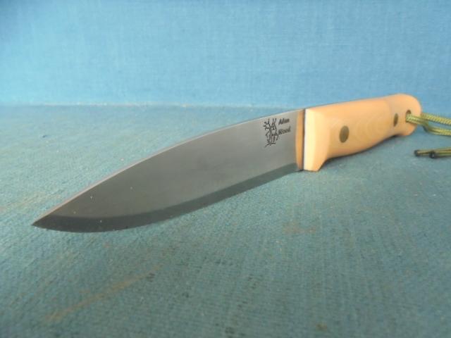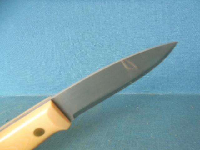 The knife is 9" overall with an off-white micarta grip with black liners, and the knife comes with its original custom-made sheath S/n 03371