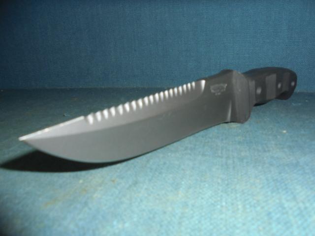 The knife has a 5" coated blade with a serrated spine and stamped BAUCHOP CUSTOM KNIVES RSA, and it is 10.5" overall