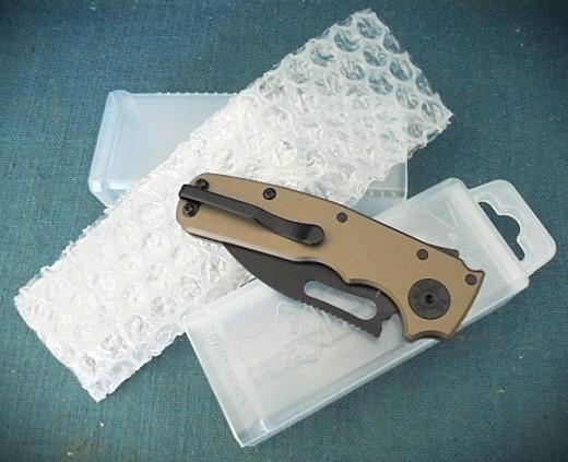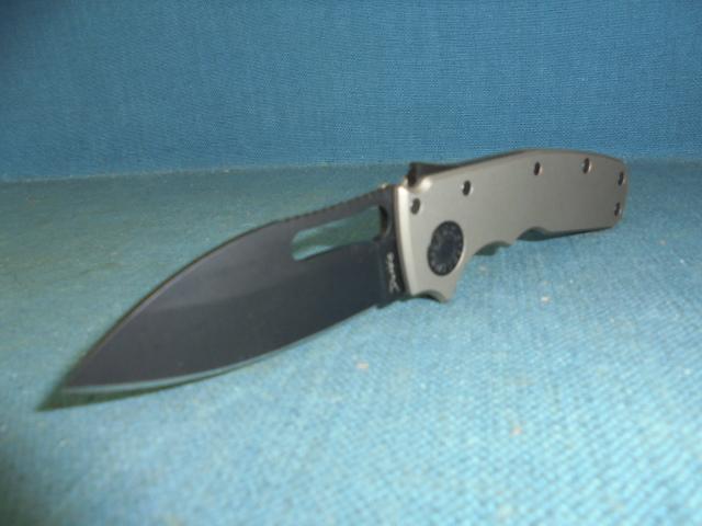 The knife is 7" overall with aluminium grips and a thumb slide release catch, and the knife comes with it plastic box S/n 03389