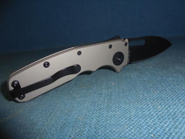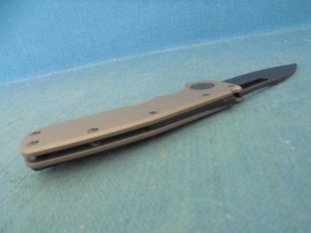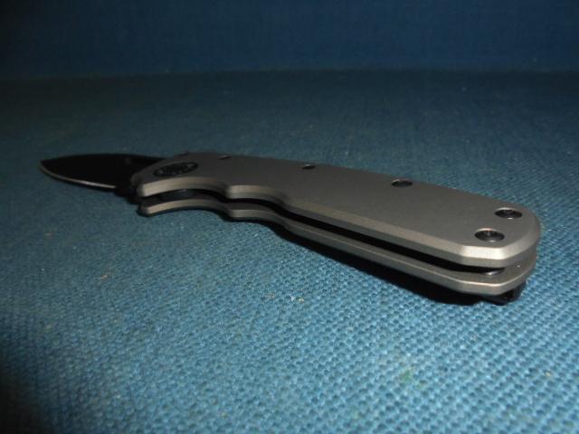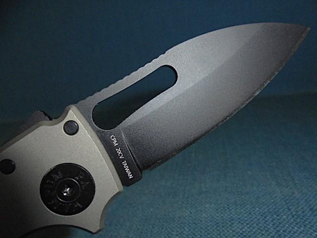 This is a quality knife with a 2.75" drop-point blackened blade, etched Demko on one side and CPM 20CV TAIWAN on the other