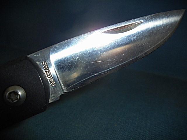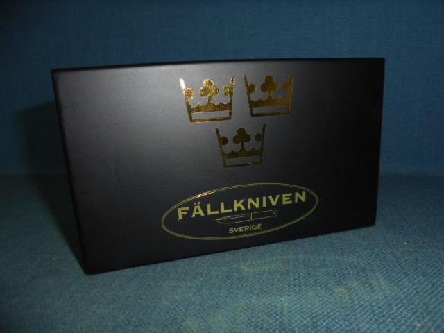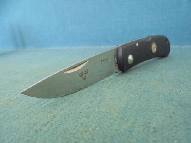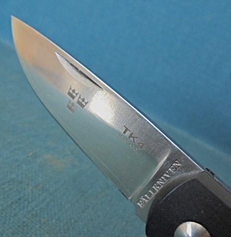 This knife has a 2.75" drop-point blade etched with three crowns TK4 3G steel, and stamped FALLKNIVEN on one side and stamped SWEDEN on the other