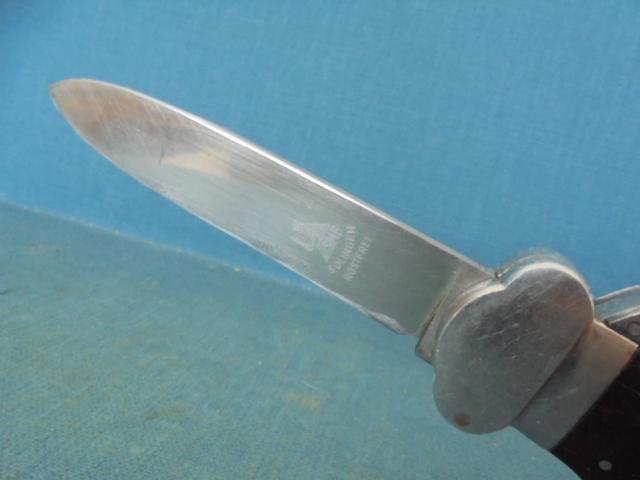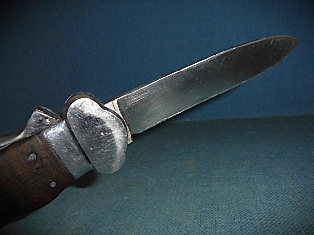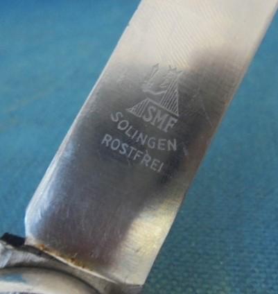 This is a rare WW11 German gravity knife with a 4" blade stamped with the seated knight SMF SOLINGEN ROSTFREI
