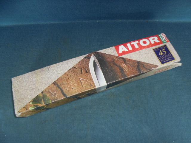 The knife has a steel guard pommel and a green plastic grip, but it has the early black leather sheath with sharpening stone in the front pouch with its original box S/n 03040