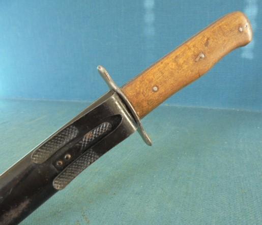 The knife is 10.75" overall with a steel guard, hardwood grip, and its original scabbard with the three prongs S/n 03104