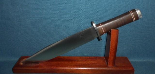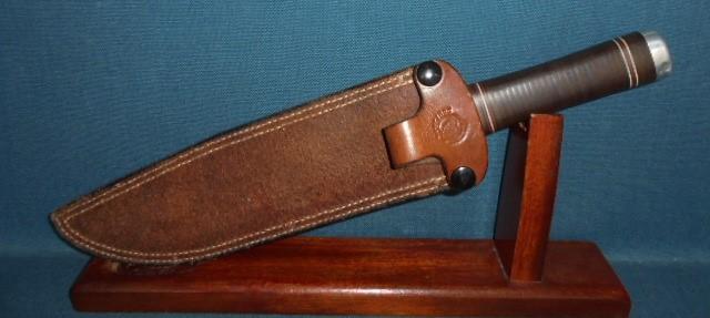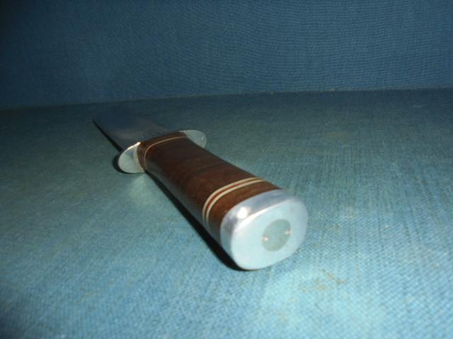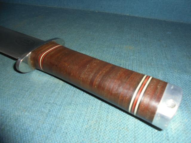 The knife is 15.25" overall with an aluminium crossguard pommel, and a stacked leather grip with black, red, and white spacers, and the knife has a custom-made leather sheath S/n 03113