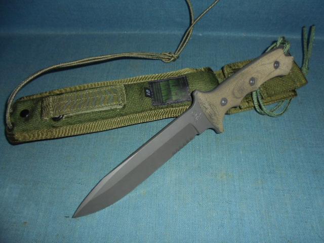The knife is 12.5" overall with a black canvas micarta grip screwed onto the full tang, and it has a blackhawk sheath, cert, box, and guarantee S/n 03117