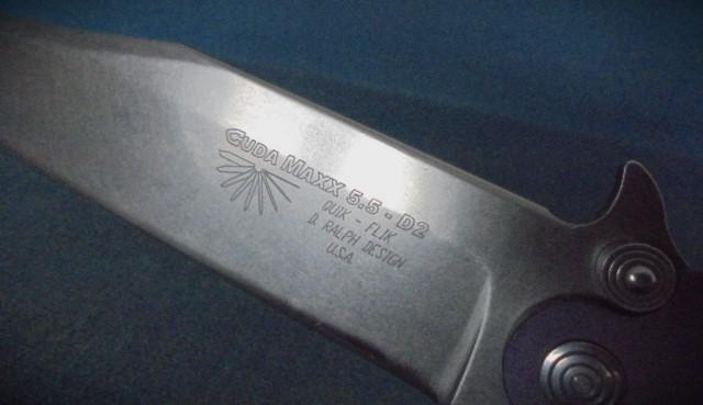 The knife has a 5.5" clipped blade etched CUDA MAXX 5.5-D2 QUIK-FLIK D. RALPH DESIGN USA, and it is 11.75" overall
