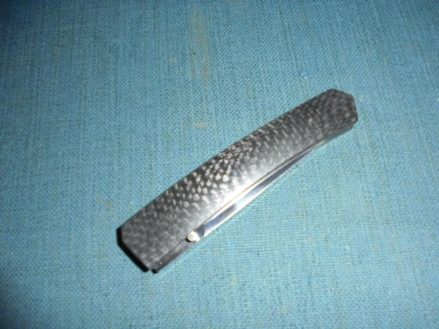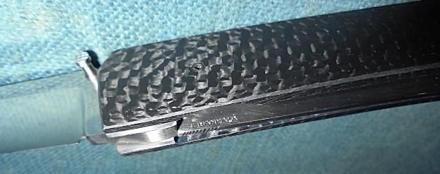The knife has a stamped crosslock (J Hankaka), and also on the inside of the body, plus carbon fibre grips, and it has its original black leather pouch, and Certificate S/n 03124