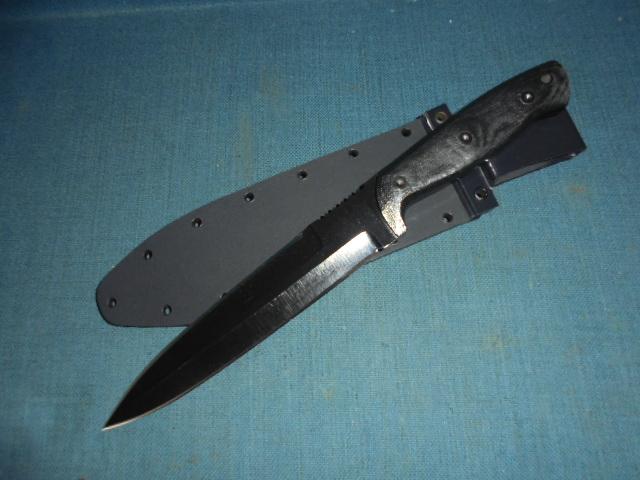 The knife is 11.25" overall with a black Micarta grip, and it has a Kydex sheath and box S/n 03127