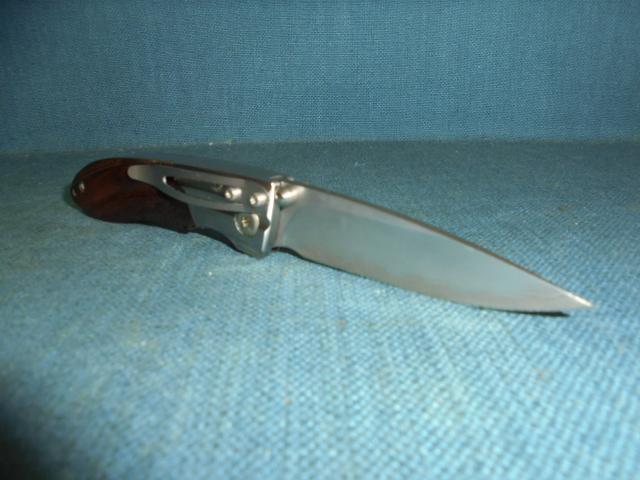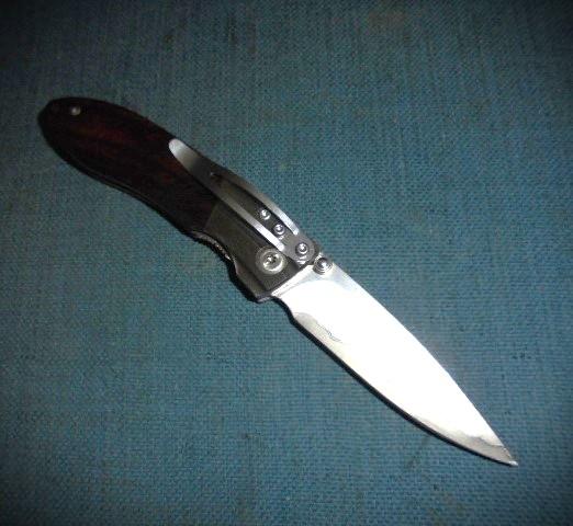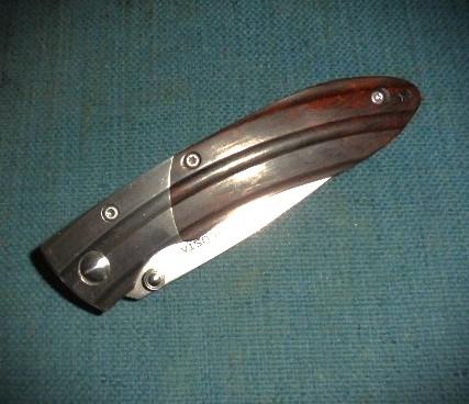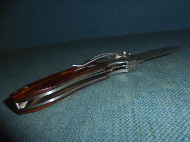 The knife is 6.5" when opened with steel bolsters and an Ironwood grip, and a crosslock release S/n 03148