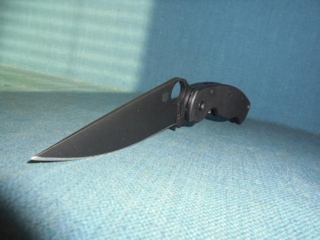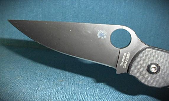 This is quite a large folder with a 4" blackened blade etched logo Spyderco CPM S30V on one side and Golden Colorado U.S.A. Earth on the other