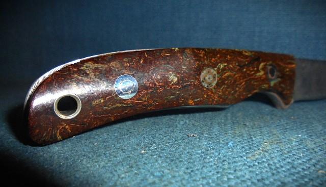 The knife has a tapered tang, a micarta grip, and a custom-made sheath S/n 03227
