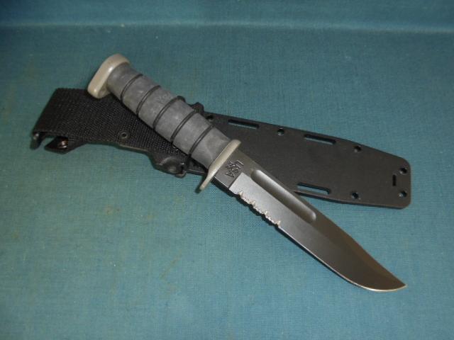 This is an upgrade with a 7" part serrated D2 coated blade stamped KA-BAR OLEAN, NY on one side and USA D2 on the other