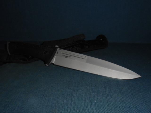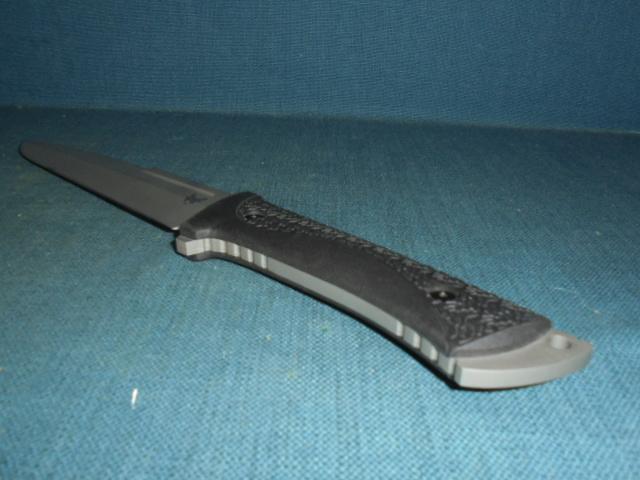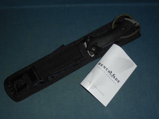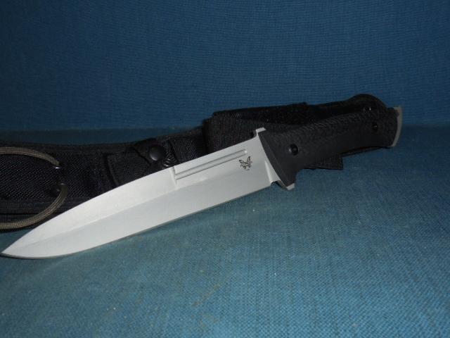 This is a large combat knife with a 7" satin-finished blade etched BENCHMADE plus logo on one side and Fecas DESIGN N609 Taiwan on the other
