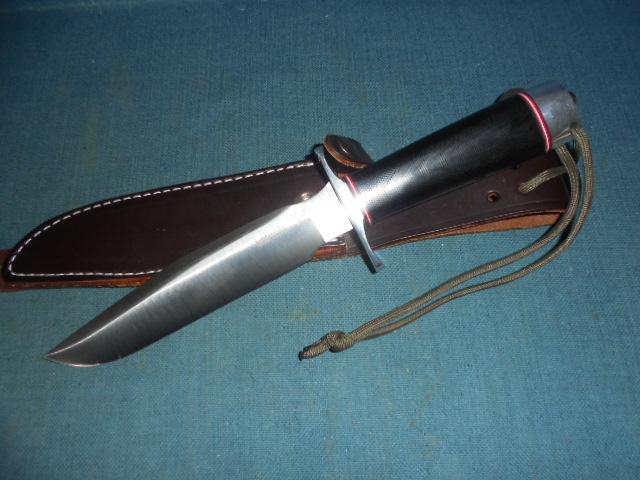 The knife is 12" overall with a steel crossguard pommel, and a black micarta grip with black/red and white spacers, and it has its original sheath stamped on the back S/n 03248