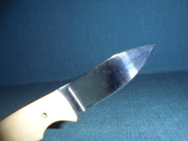 The knife has a tapered tang with red liners and an Ivorine grip pinned onto the full tang, and it comes with its original sheath S/n 03257