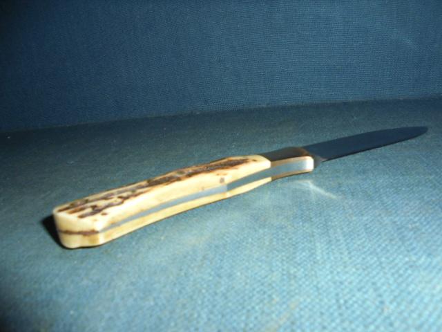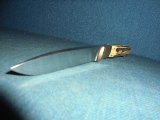 The knife is 8.25" overall with a tapered tang, copper bolsters, and a stag horn grip pinned onto the full tang, and it comes with its original sheath S/n 03258