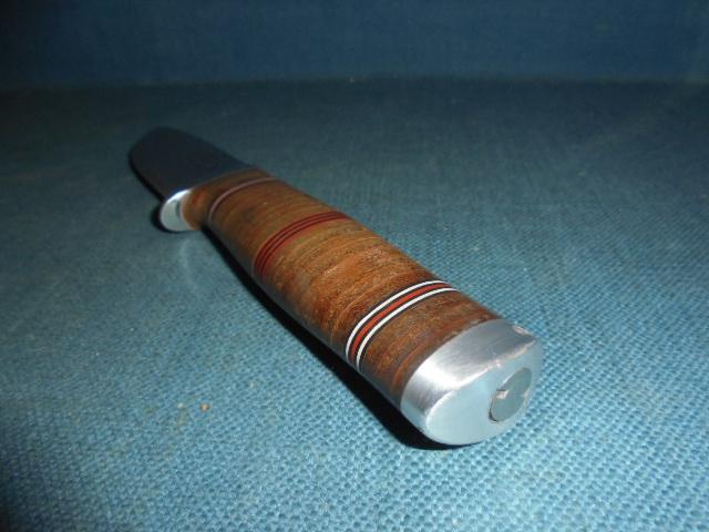 The knife has a stacked leather grip with red/black and white spacers, and it has its original sheath S/n 03266
