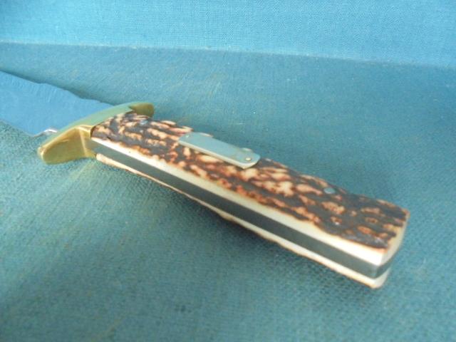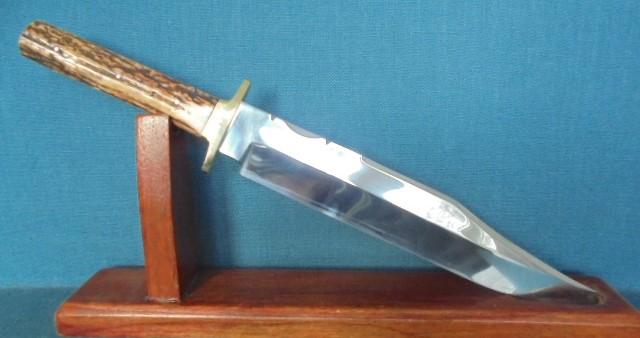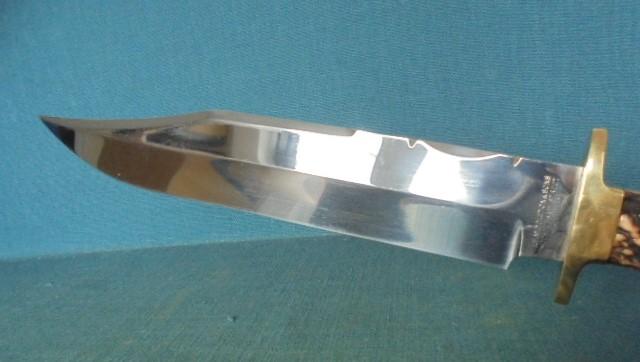 The knife is 15.5" overall with a brass crossguard and a stag horn grip with an escutcheon plate, and it has a standard sheath S/n 03269