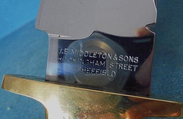 This is a large Bowie with a 10.25" clipped blade with a scalloped spine stamped J.E.MIDDLETON & SONS ROCKINGHAM STREET SHEFFIELD on the ricasso
