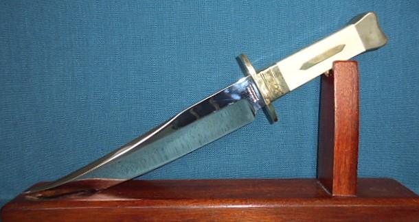 Both knives have nickel-silver bodies with bone grips, with an escutcheon plate on both sides of the grip, and both have their original sheaths S/n 03275